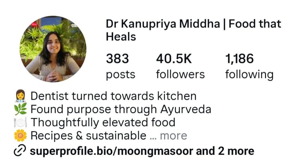 Dr Kanupriya Middha (Moong Masoor)Health-conscious Indian cookingEducational, accessibleLinks nutrition science with everyday Indian ingredients.40.6K
