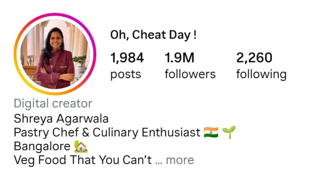 Shreya Agarwala (Oh Cheat Day)Desserts, indulgent foodCelebration-ledCelebrates “cheat-day” culture and food as pleasure.1.9M